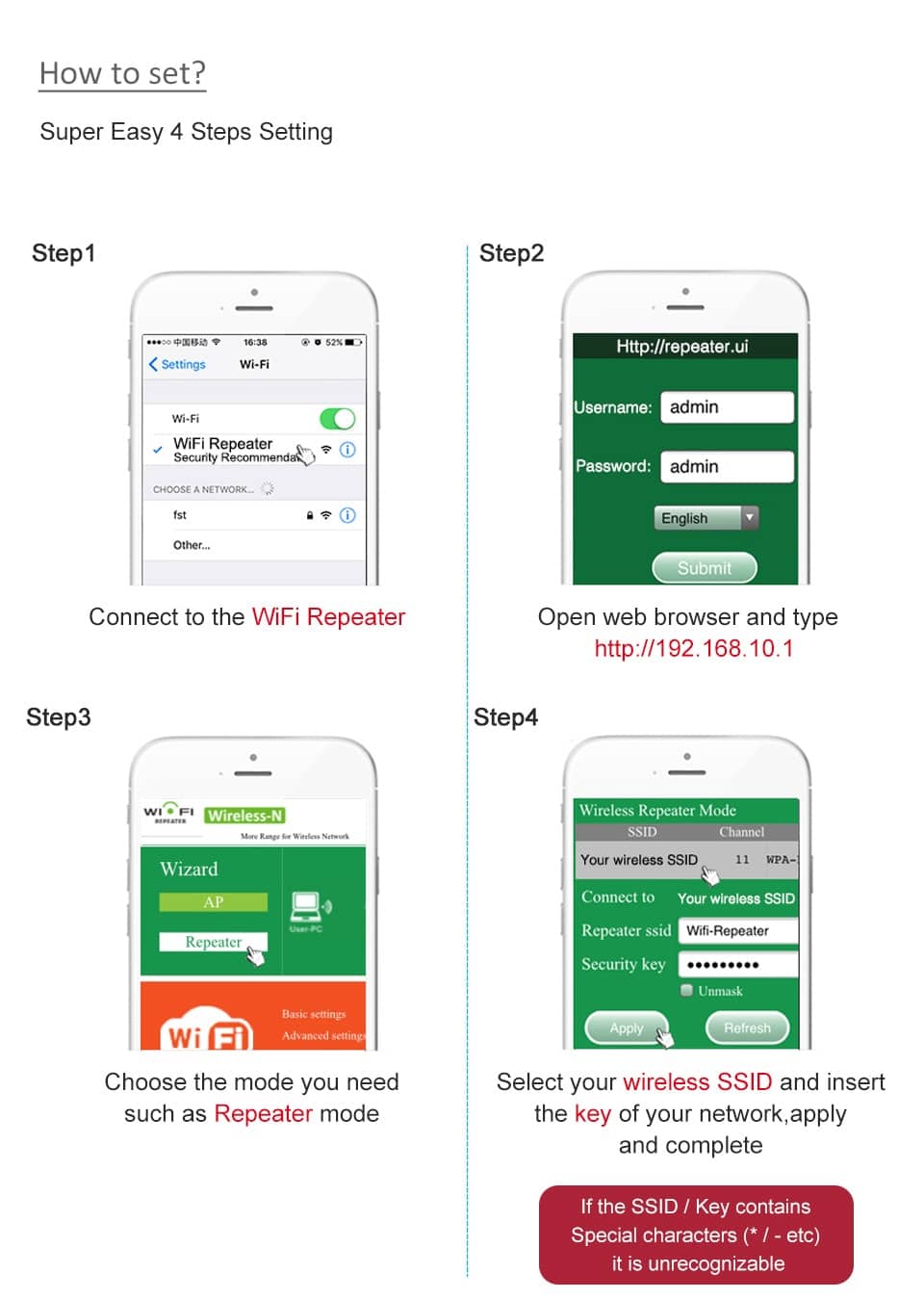 1.Make sure the Repeater is placed in a location where it can receive a strong signal from your desired wireless Internet connection. The Repeater will not workwithout a signal that it can repeat.