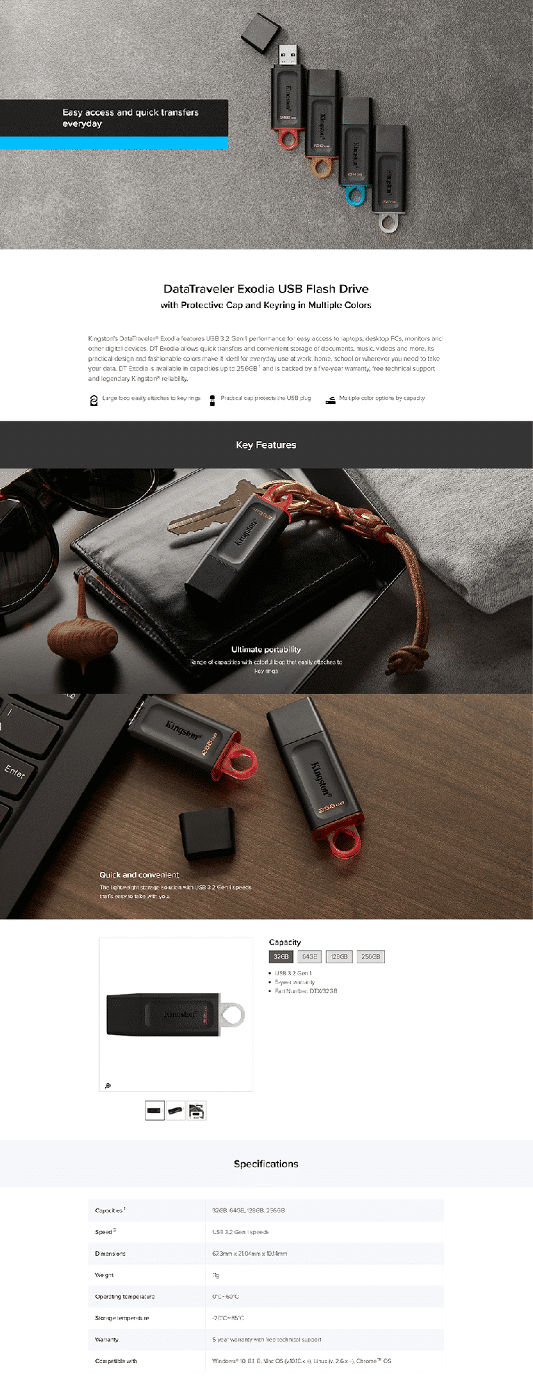 Kingston’s DataTraveler® Exodia features USB 3.2 Gen 1 performance for easy access to laptops, desktop PCs, monitors and other digital devices. DT Exodia allows quick transfers and convenient storage of documents, music, videos and more. Its practical design and fashionable colors make it ideal for everyday use at work, home, school or wherever you need to take your data. DT Exodia is available in capacities up to 256GB and is backed by a five-year warranty, free technical support and legendary Kingston® reliability.