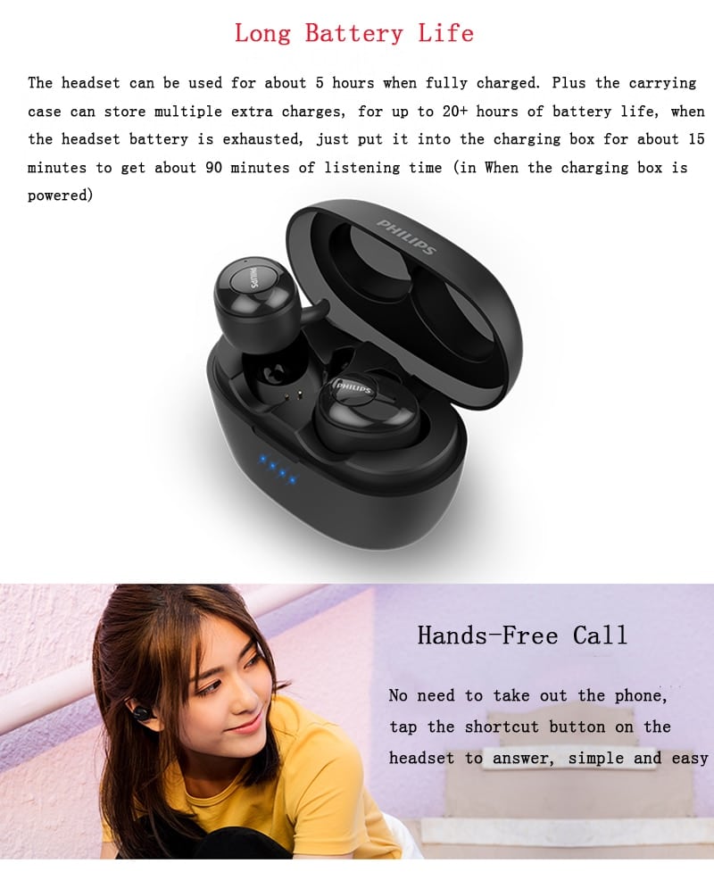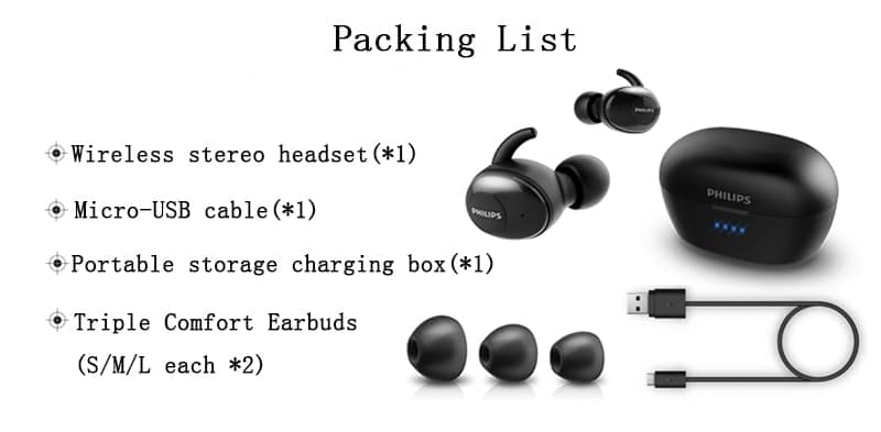 Philips SHB2505*1/Earphone Sets*6/USB Charging Cable*1/ Manual*1/Charge Box*1