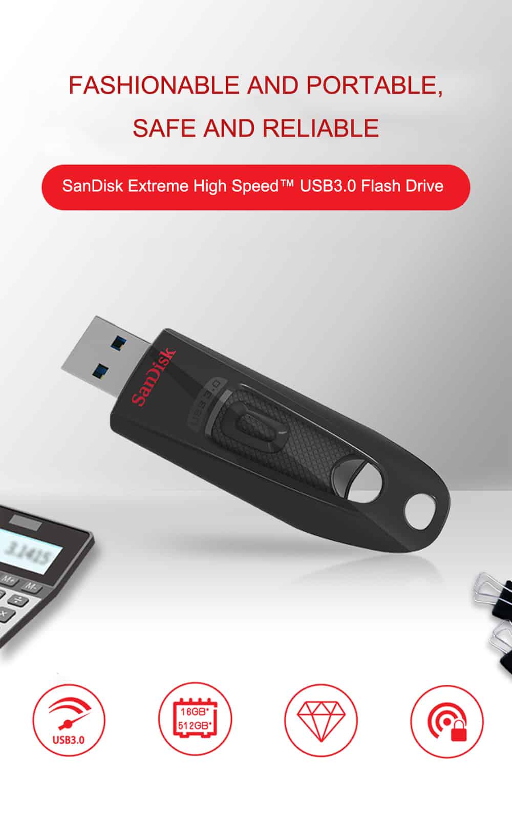 The SanDisk Extreme 3.0 USB flash drive is small and stylish, combining both fast data transfer speed and higher capacity. This flash drive reduces your wait time and file transfer speeds up to 10 times faster than standard USB 2.0 flash drives. With a storage capacity of up to 256GB, huge media files and documents can be easily handled.